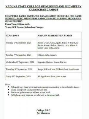 This is to inform all prospective students of Kaduna State college of Nursing and Midwifery that the 2021/2022 Entrance Examination has been scheduled to hold as follows;